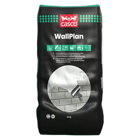 Casco® WallPlan on vähäpölyinen sementtipohjainen märkätilatasoite kuivien, kosteiden ja märkien tilojen sisäseinien ja kattojen pohjatasoitukseen, erityisesti laatoituksen ja vedeneristyksen alle. Soveltuu harkko-, kevytbetoni-, tiili- ja betonipinnoille. Ei lattioille eikä pehmeille kalkkisementtirappauksille.